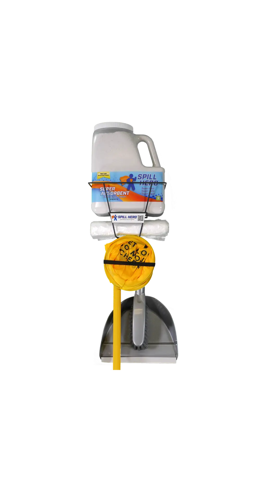 Heavy duty metal wire rack that can be mounted on walls and poles in high-risk areas for easy access to all of the materials needed for spill response. Spill Hero granular absorbent will leave your floors clean, dry and residue free in a matter of minutes.