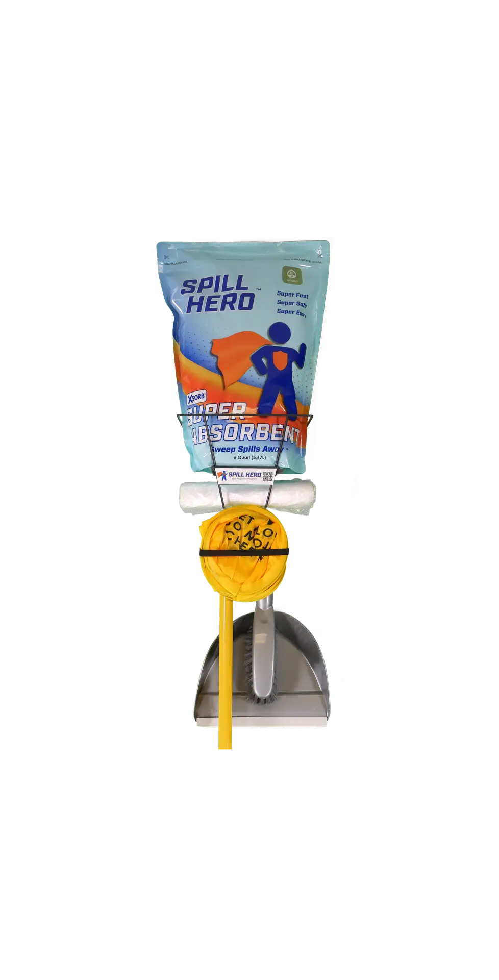 The Spill Hero Spill Station is custom-made to hold the Spill Hero Spill Clean-Up Absorbent. Spill Hero will leave your floors clean, dry and residue free in a matter of minutes. All clean up items are easily accessible. Easily mount to a wall or pole for convenient access when spills happen making clean up fast and easy.