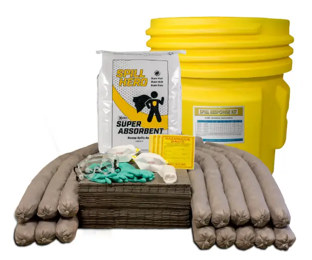 Includes the Spill Hero Universal Granular Absorbent, universal socks, pads, and PPE for quick response to spills! Absorbent socks stop and surround running liquids, and the pads and loose absorbent soak up spills on contact.